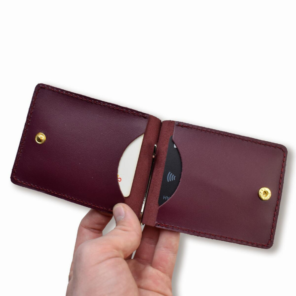 Компактний формат дозволяє затискачеві легко вміщуватися у кишені, а надійна металева кліпса міцно фіксує банкноти. Дві внутрішні кишені під картки допомагають тримати банківські картки, документи чи візитки в порядку — зручно та без зайвого об’єму.