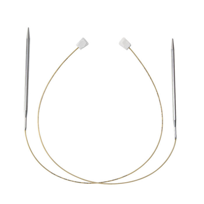 Кругові спиці складаються з двох жорстких кінців та гнучкого кабелю між ними. Незнімна конструкція забезпечує стабільне з’єднання та оптимальне ковзання петель під час роботи. У наявності варіанти довжиною від 25 до 150 см, що дозволяє обрати інструмент під конкретний проєкт. Доступні тонкі, середні та товсті діаметри.