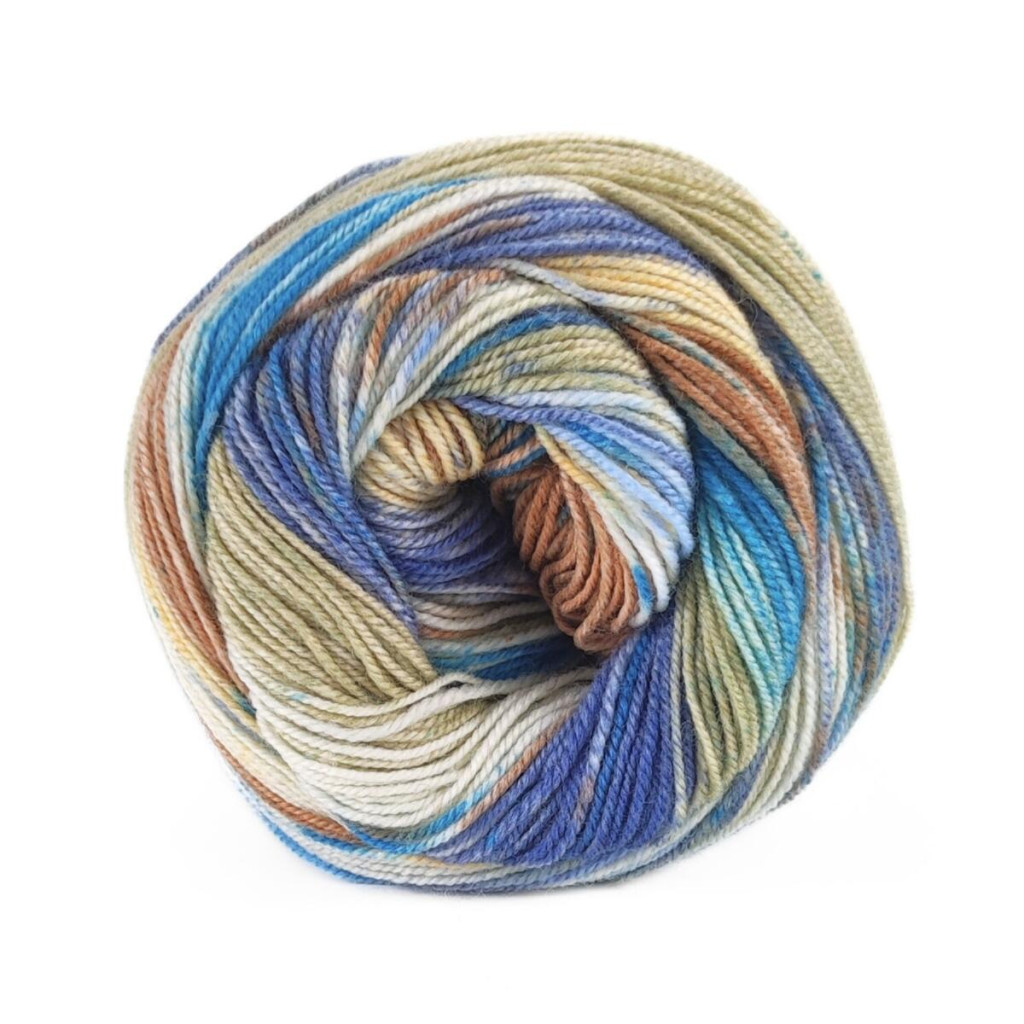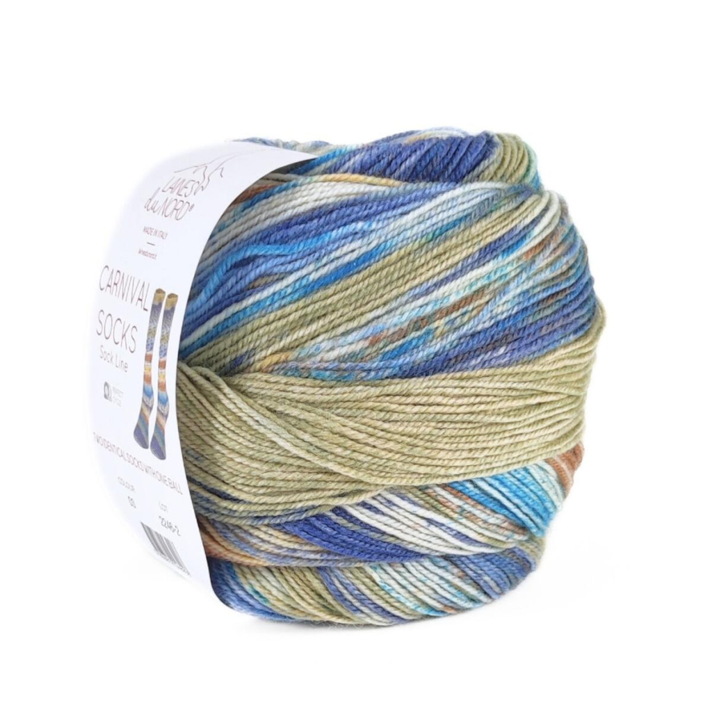Пряжа Carnival Sock - шкарпеткова нитка з м’якої вовни та нейлону, розрахована на зносостійкі вироби з акуратним візерунком. У палітрі поєднуються відтінки з ефектом délavé та дрібні розсіяні «вкраплення», які додають полотну стриманої декоративності.