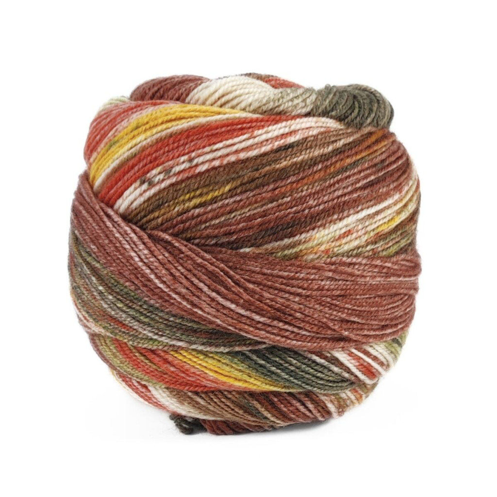 Пряжа Carnival Sock - шкарпеткова нитка з м’якої вовни та нейлону, розрахована на зносостійкі вироби з акуратним візерунком. У палітрі поєднуються відтінки з ефектом délavé та дрібні розсіяні «вкраплення», які додають полотну стриманої декоративності.