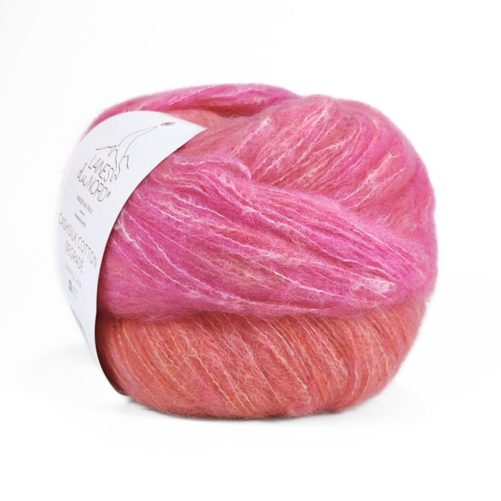 Пряжа Laines du Nord Cashsilk Cotton належить до лінійки Cashsilk Cotton Degradé - це поєднання благородних волокон для елегантної, м’якої та дуже легкої нитки з делікатним «припушеним» ефектом. Двоколірні переходи створюють плавне градієнтне забарвлення у полотні, тому навіть прості візерунки виглядають виразно й акуратно.