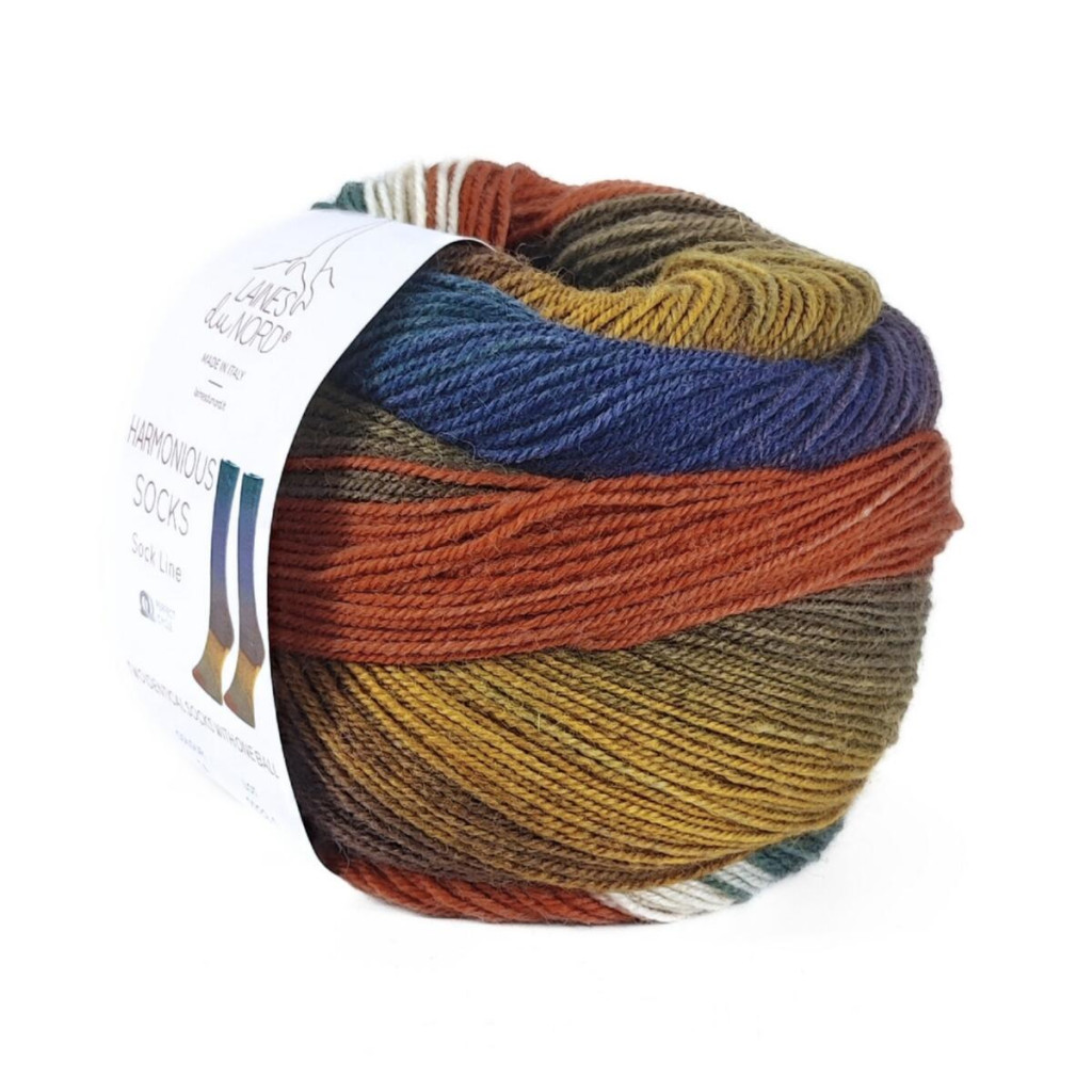 Пряжа Laines du Nord Harmonious Sock - шкарпеткова нитка з яскравими відтінками, які плавно й гармонійно змішуються у полотні, створюючи енергійний та впізнаваний візерунок. Вона поєднує м’якість і міцність: вовна у складі mulesing-free та має обробку без хлору, а додавання нейлону підвищує зносостійкість, що особливо важливо для шкарпеток і виробів, які активно носяться.