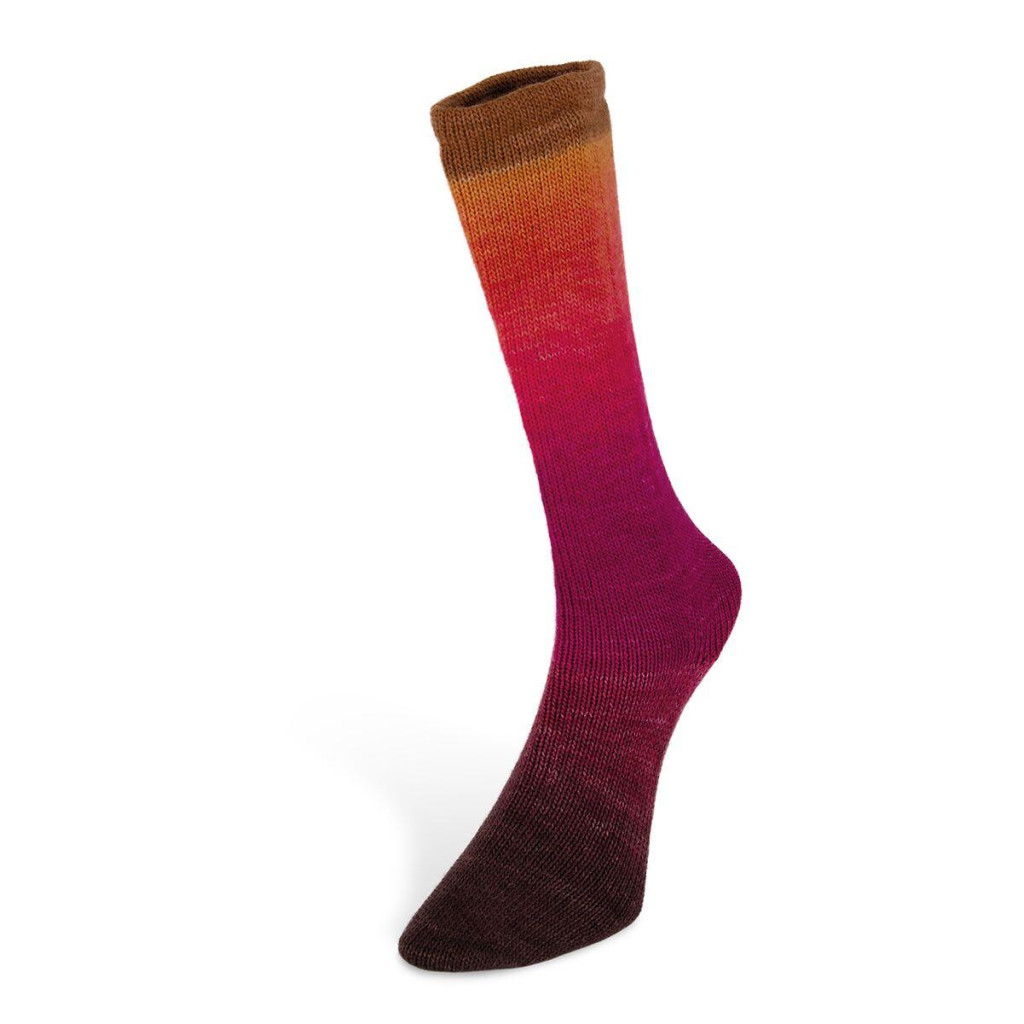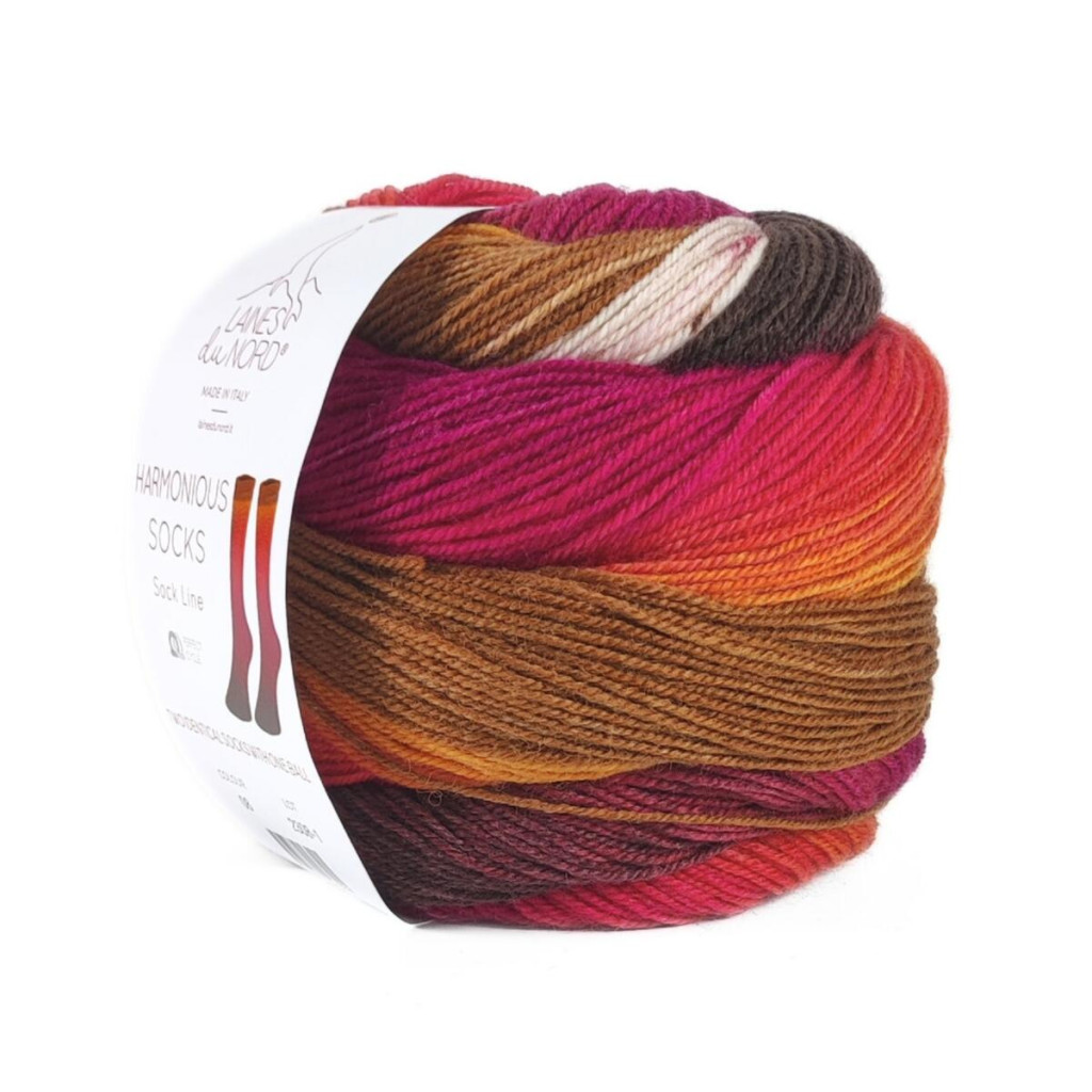 Пряжа Laines du Nord Harmonious Sock - шкарпеткова нитка з яскравими відтінками, які плавно й гармонійно змішуються у полотні, створюючи енергійний та впізнаваний візерунок. Вона поєднує м’якість і міцність: вовна у складі mulesing-free та має обробку без хлору, а додавання нейлону підвищує зносостійкість, що особливо важливо для шкарпеток і виробів, які активно носяться.