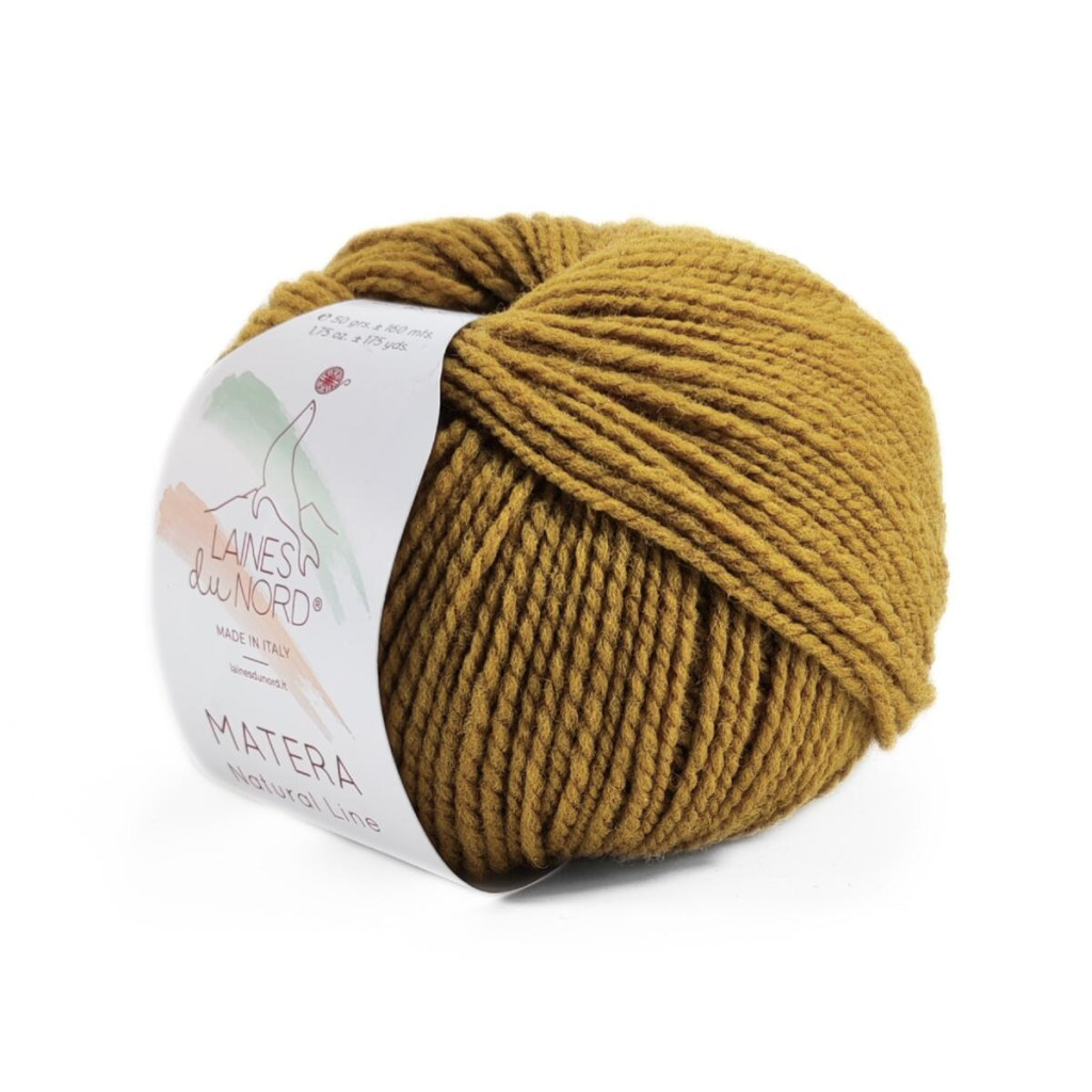 Пряжа Laines du Nord Matera - 100% італійська мериносова вовна Gentile з Апулії. Нитка має середню товщину та легку пружність, добре «лягає» на спиці, формує рівне полотно й комфортно відчувається у теплих сезонних виробах. За описом виробника, вона доволі витривала, трохи суха на дотик і має властивість протидіяти появі ковтунців, тому підходить для речей, які плануєте носити регулярно.