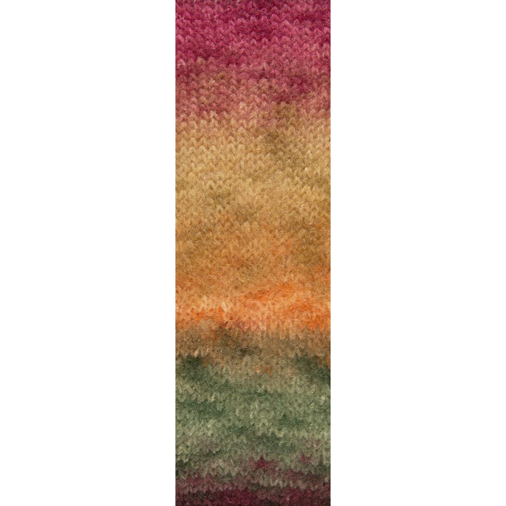 Полотно з цієї пряжі виходить легким, повітряним і пухнастим, з характерним мохеровим ворсом. Нитка красиво розкривається у в’язанні, створюючи об’ємну текстуру та плавні переходи кольорів.