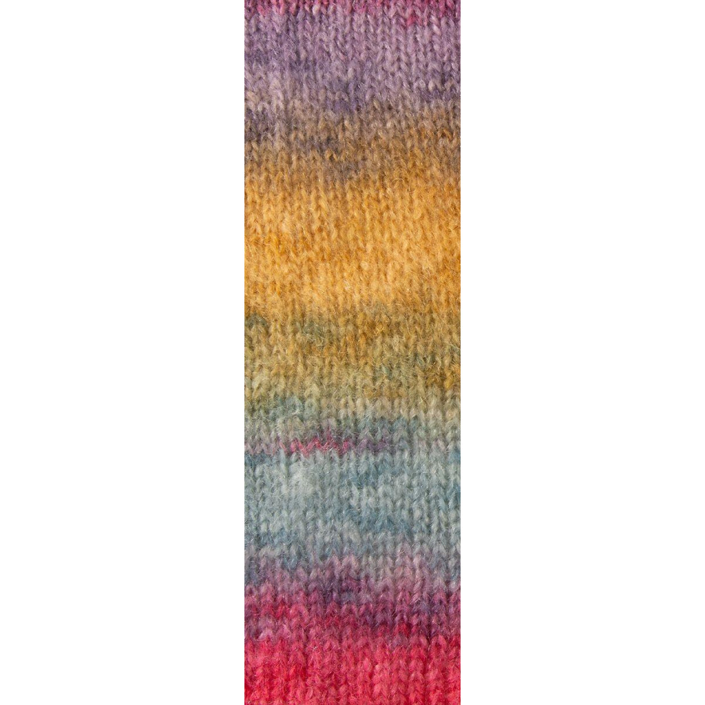 Полотно з цієї пряжі виходить легким, повітряним і пухнастим, з характерним мохеровим ворсом. Нитка красиво розкривається у в’язанні, створюючи об’ємну текстуру та плавні переходи кольорів.