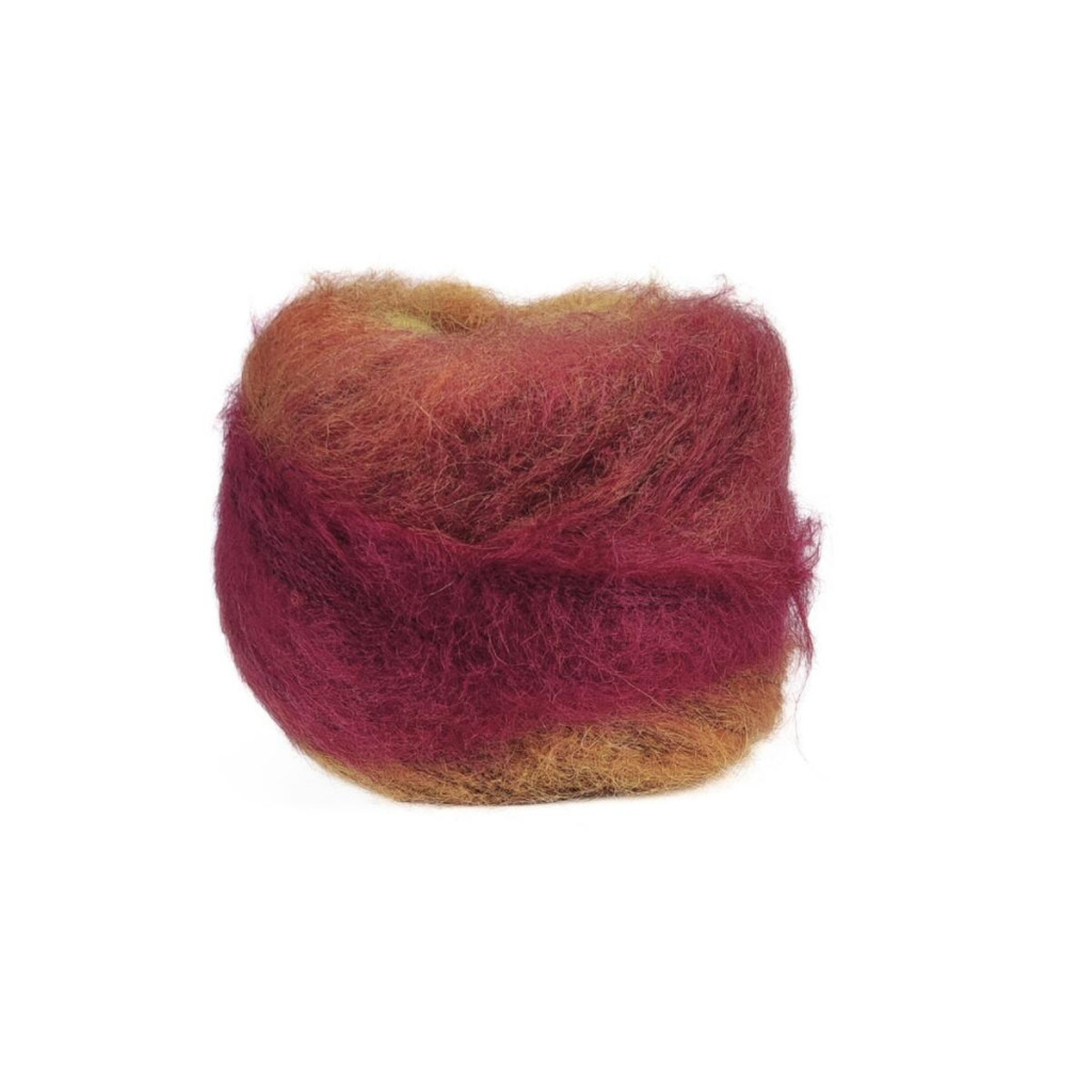 Плавні переходи кольорів формують градієнт без необхідності змінювати нитку під час в’язання. Завдяки мохеру полотно має ніжний ворс, а шовк додає міцності та легкого природного блиску.