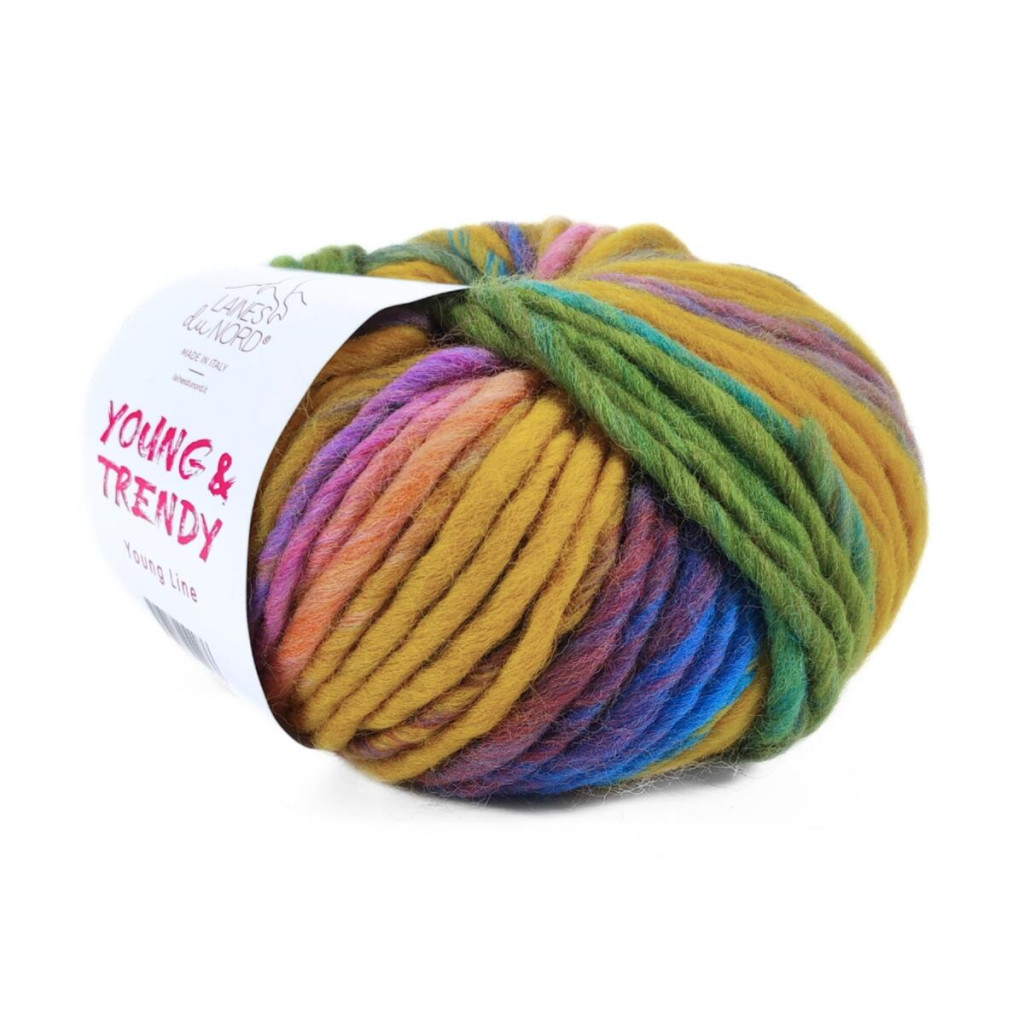 Пряжа Laines du Nord Young Trendy — це об’ємна фантазійна нитка з яскравими кольоровими переходами, яка створює ефектний і сучасний вигляд готових виробів. Завдяки своїй товщині вона дозволяє швидко зв’язати виріб навіть великими спицями.