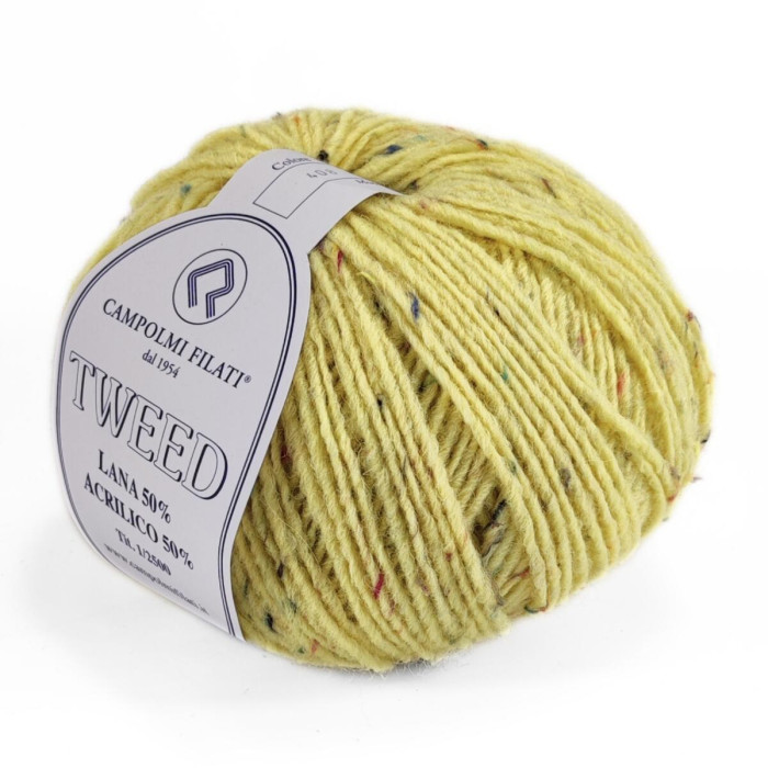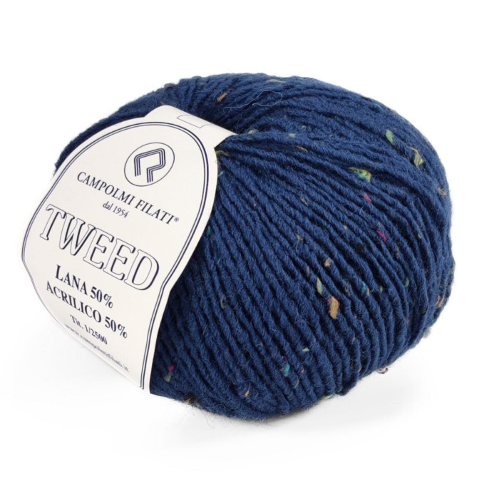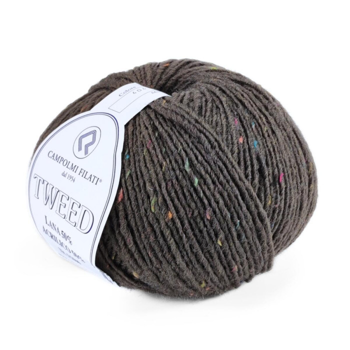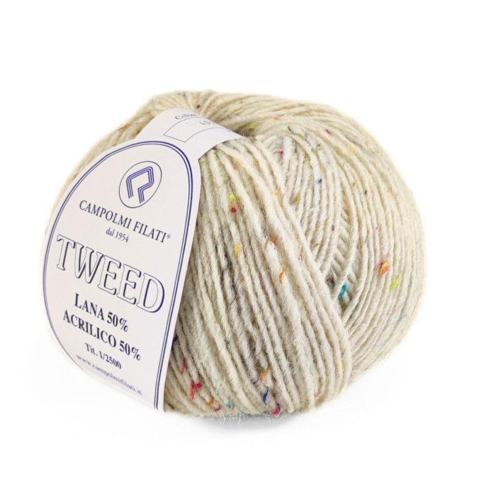 До складу пряжі входить 50% вовни, яка забезпечує тепло, м’якість і комфорт, та 50% акрилу, що додає зносостійкості й полегшує догляд. Особливістю Campolmi Tweed є наявність дрібних кольорових вкраплень, які створюють характерний "крапчастий" ефект на полотні та роблять навіть найпростіший виріб візуально цікавим.