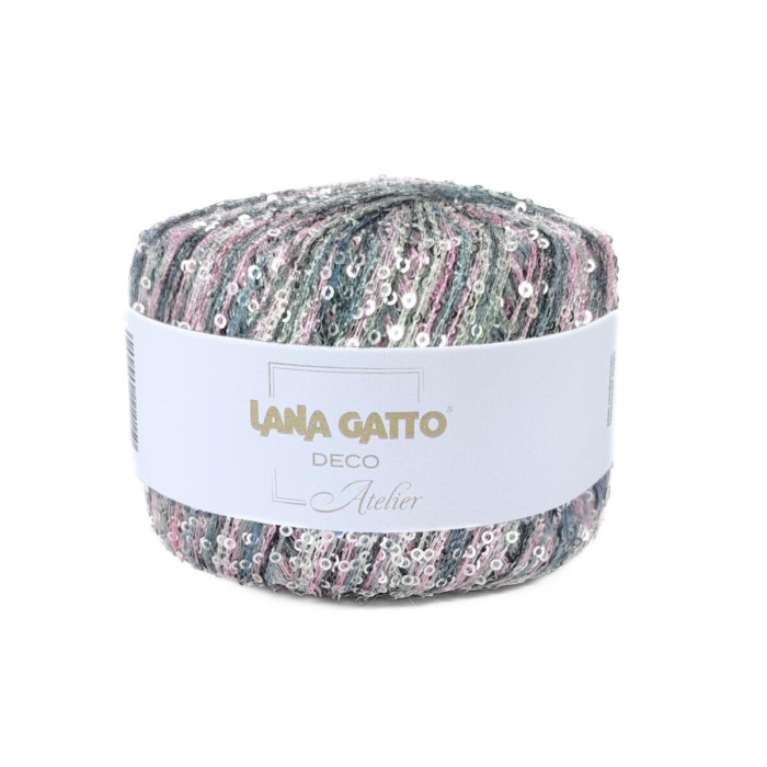 Пряжа Lana Gatto Deco - декоративна фантазійна пряжа з виразним мультиколорним міксом та додаванням блискучих мікропаєток, створена для акцентних і стильних в’язаних виробів. Вона має легку об’ємну структуру та яскравий зовнішній вигляд, який робить навіть прості моделі ефектними.
