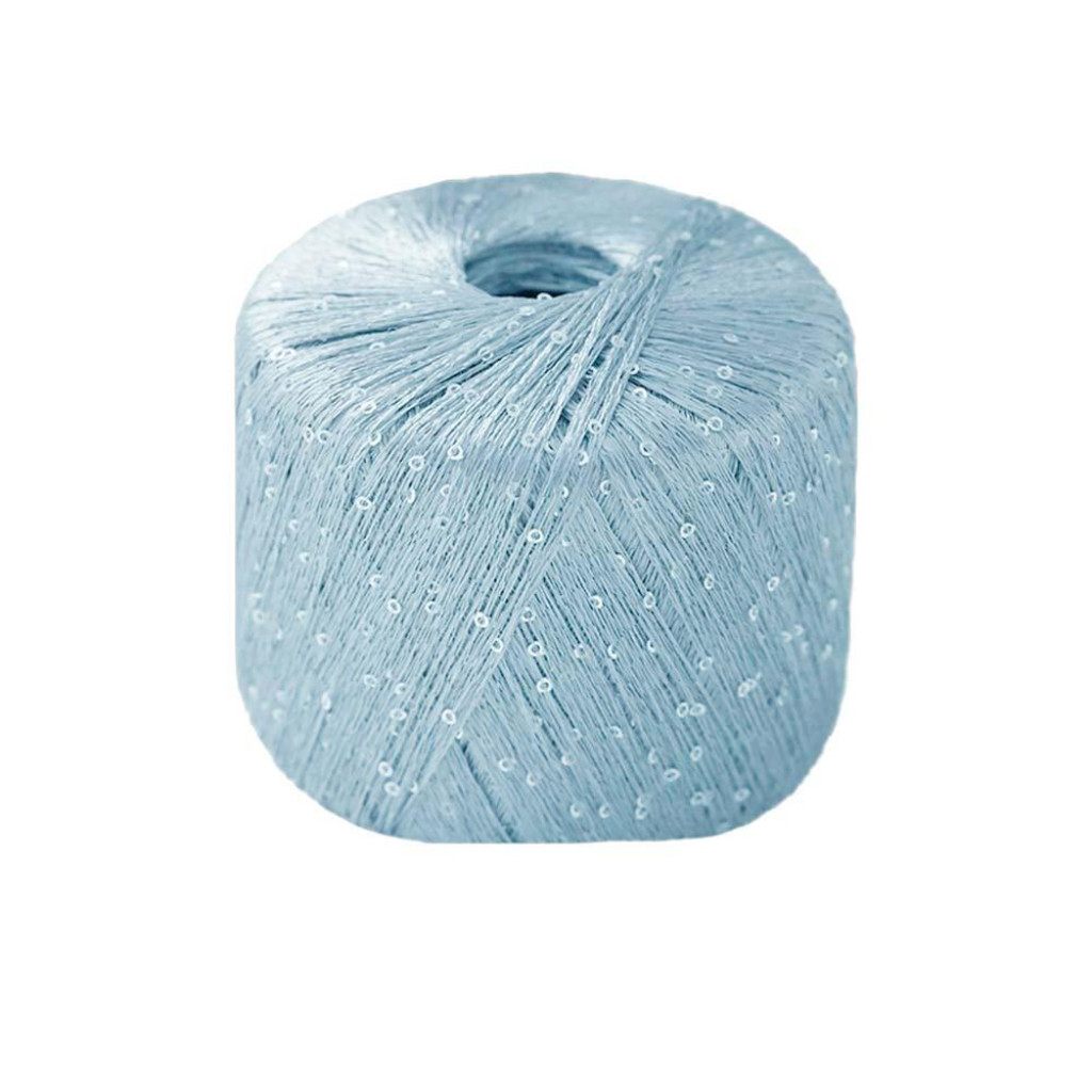 Тонка поліестерова нитка забезпечує міцність і стабільність, а вбудовані голографічні паєтки рівномірно розподіляються по всій довжині пряжі, створюючи делікатне мерехтіння під час руху. Пряжа не обтяжує виріб і зручна у роботі.