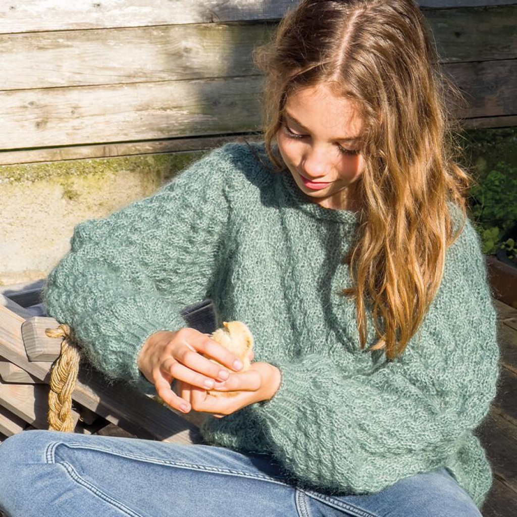 Кід мохер надає пряжі характерної м’якості, легкості й теплоізоляційних властивостей, а акрил забезпечує стабільність нитки, міцність і простоту у догляді. Завдяки такому поєднанню вироби добре тримають форму та комфортні у носінні.