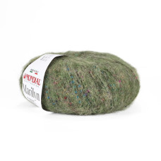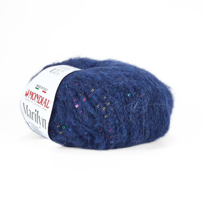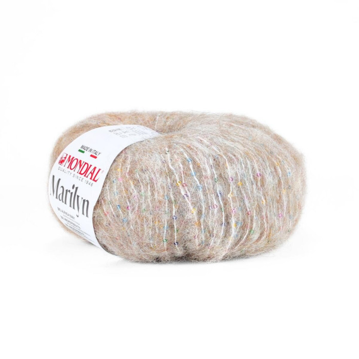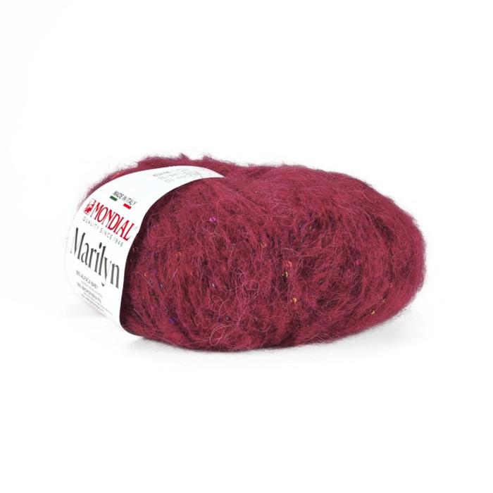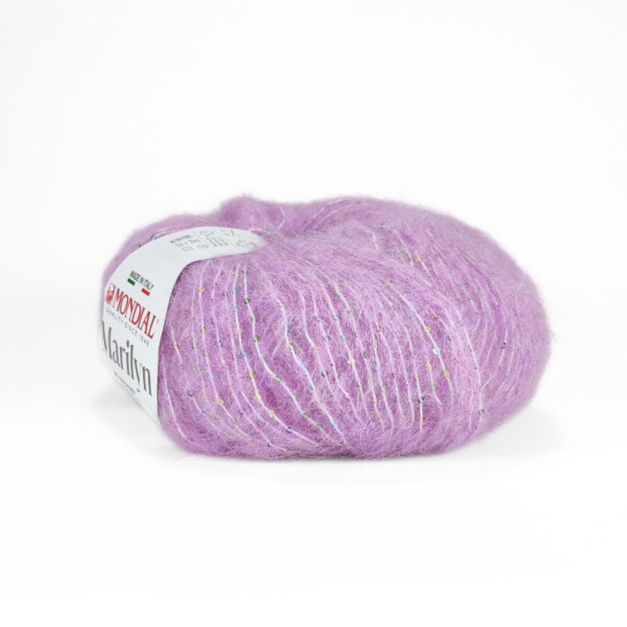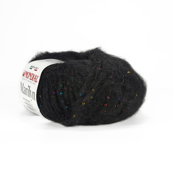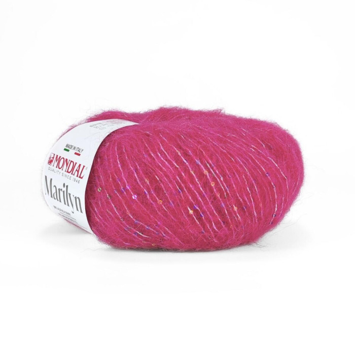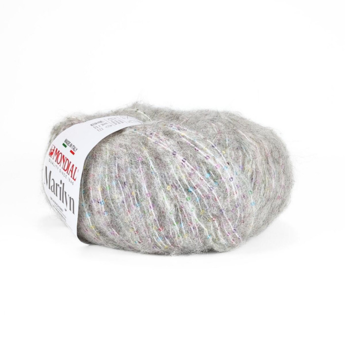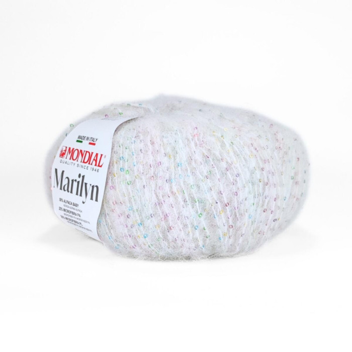 Пряжа Mondial Marilyn — це вишукана італійська фантазійна нитка, яка поєднує натуральну м’якість альпаки з блиском кольорових паєток. Завдяки ворсистій фактурі нитка створює ефект легкого пухнастого серпанку, а дрібні паєтки делікатно мерехтять у полотні, додаючи святковості та глибини навіть найпростішим формам.