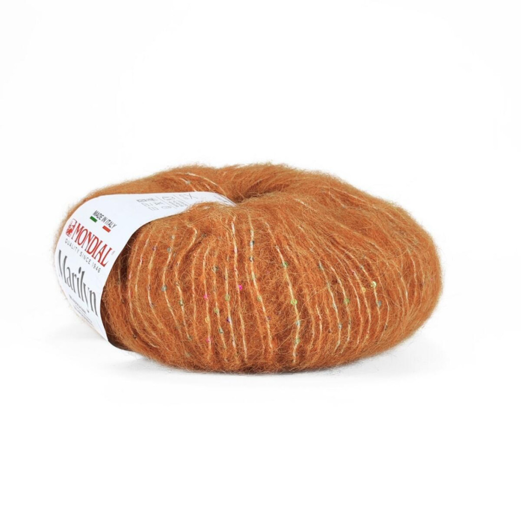 Пряжа Mondial Marilyn - м’яка та комфортна пряжа з поєднанням натуральної альпаки й сучасних мікрофібр та із кольоровими паєтками, створена для теплих і водночас легких в’язаних виробів. Вона має приємну, злегка пухнасту текстуру та формує рівне, акуратне полотно з хорошою драпіровкою.