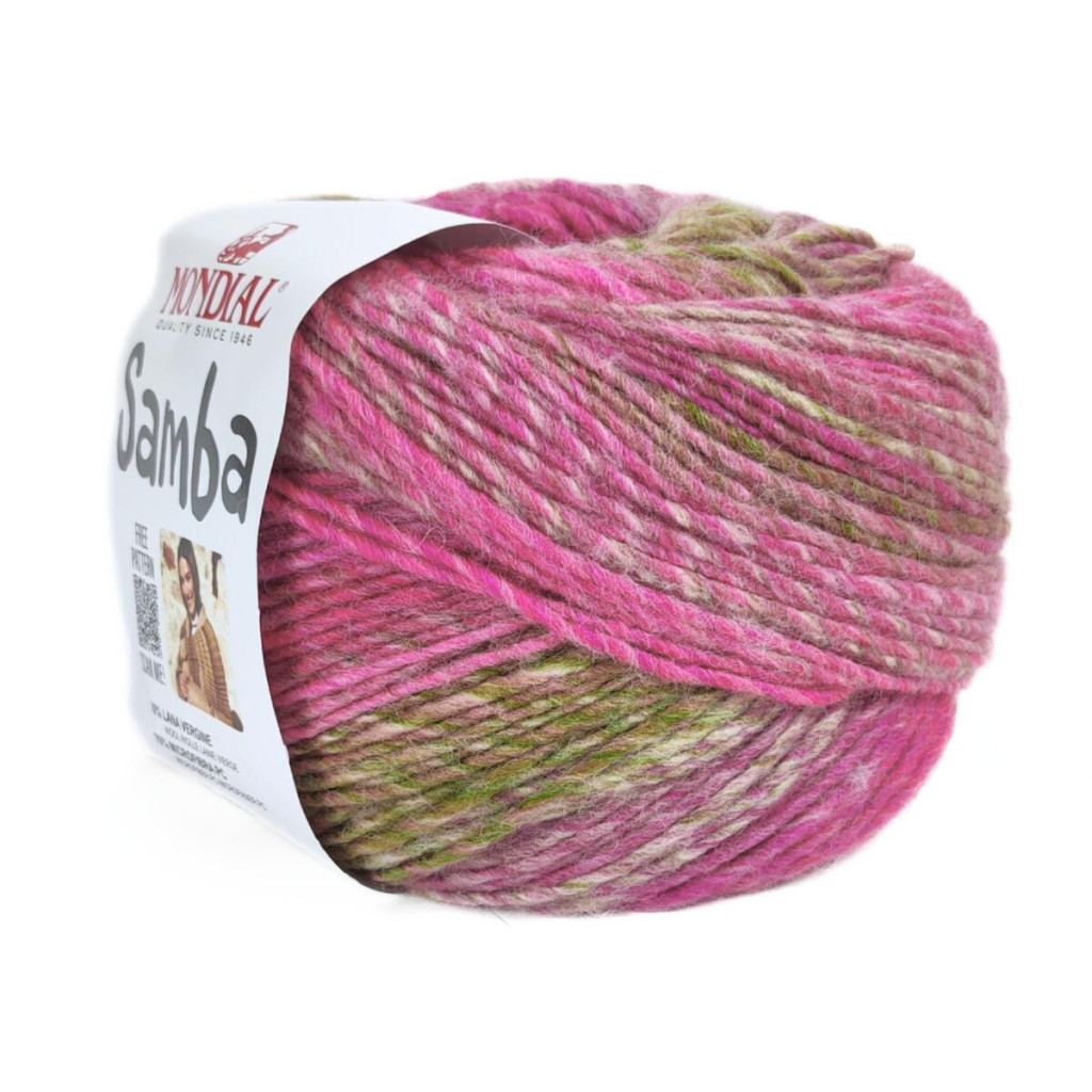 Пряжа Mondial Samba — практична та м’яка пряжа у великому форматі мотка, створена для комфортних і довговічних в’язаних виробів. Вона має рівну структуру, легко лягає у петлі та дозволяє отримати акуратне, стабільне полотно без зайвих з’єднань нитки.