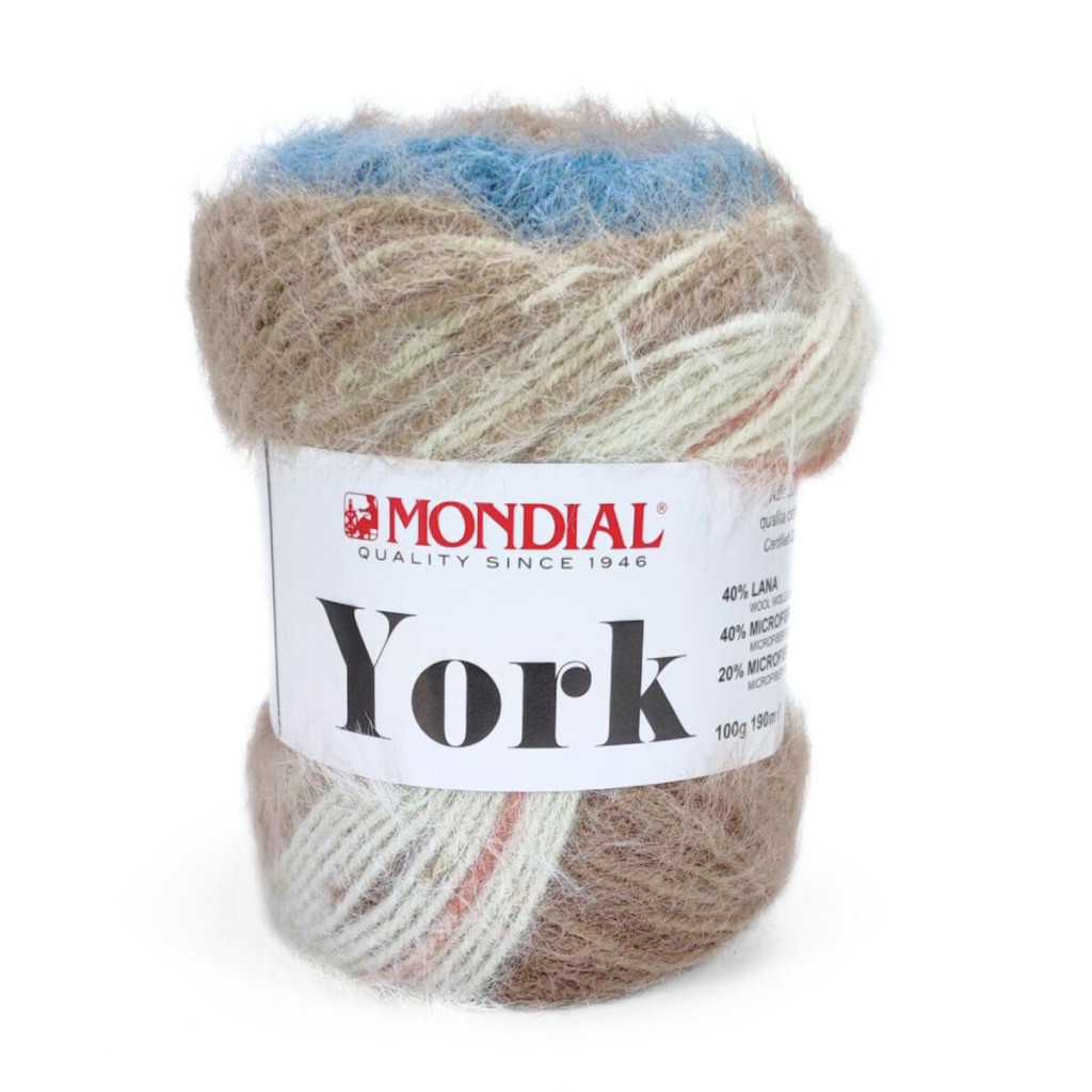 Пряжа Mondial York - універсальна та практична пряжа з поєднанням натуральної вовни й сучасних мікрофібр, створена для теплих і зносостійких в’язаних виробів. Вона має рівну, щільну структуру, добре лягає у петлі та формує акуратне, стабільне полотно.
