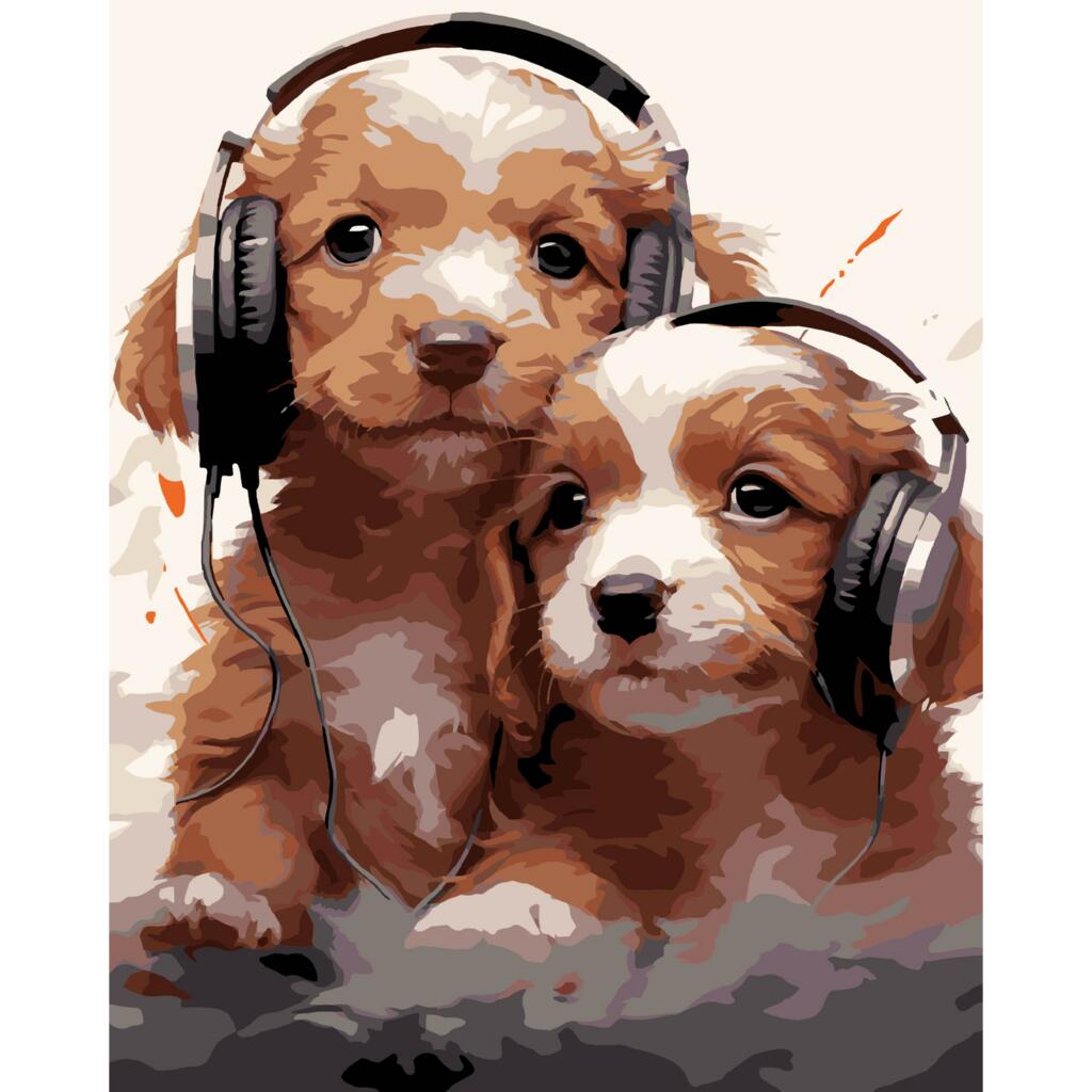 AH1218-19 Strateg Картина за номерами - Цуценята в навушниках 40x50 см (на чорному фоні, Стратег)