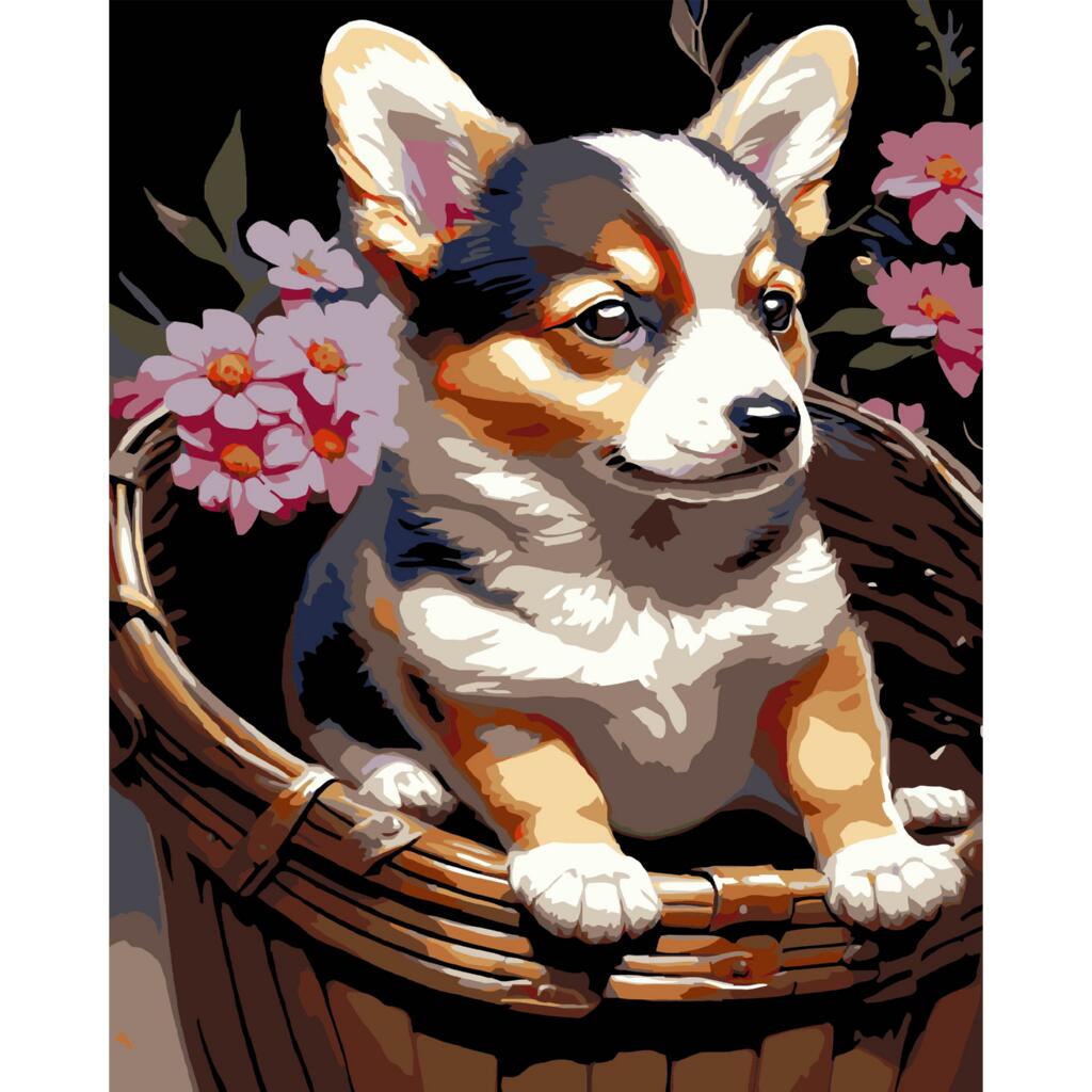 AH1220-19 Strateg Картина за номерами - Цуценя у кошику 40x50 см (на чорному фоні, Стратег)